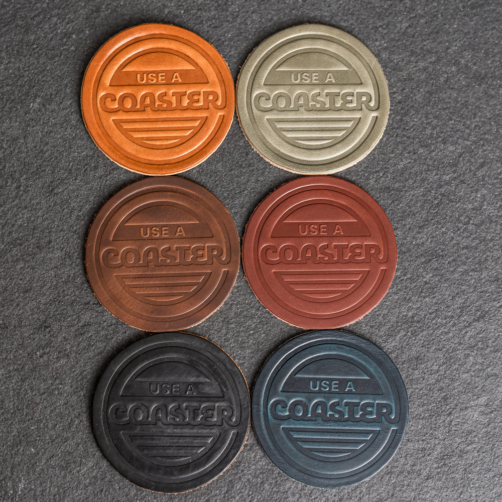 These stylish full grain leather coasters offer sophisticated protection for your table surface with a unique Use a Coaster stamp design. Sold individually or as a set of 4, they make a great addition to any home or office decor. Excite your guests and add an artistic touch to your space!
