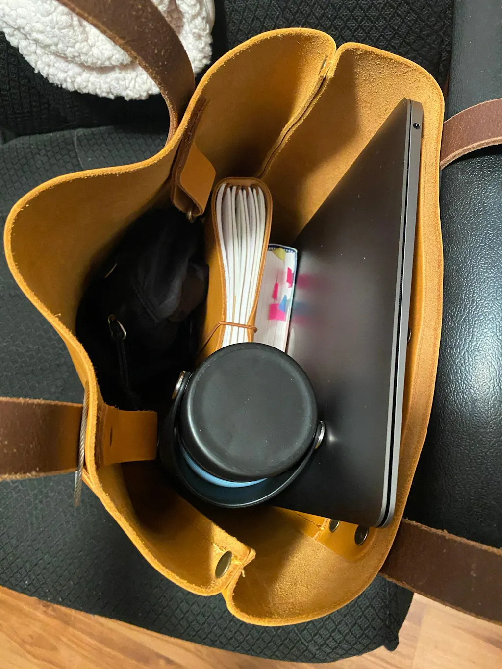 I bought the MED in saddle tan (it looks yellow in the pics but it's more of a light brown/orange, which is what I was expecting bc I have the matching journal). It fits my MacBook Air, water bottle, Bible, journal and small hip pack…just what I wanted it for. It's sturdy and I anticipate it'll last a long time!