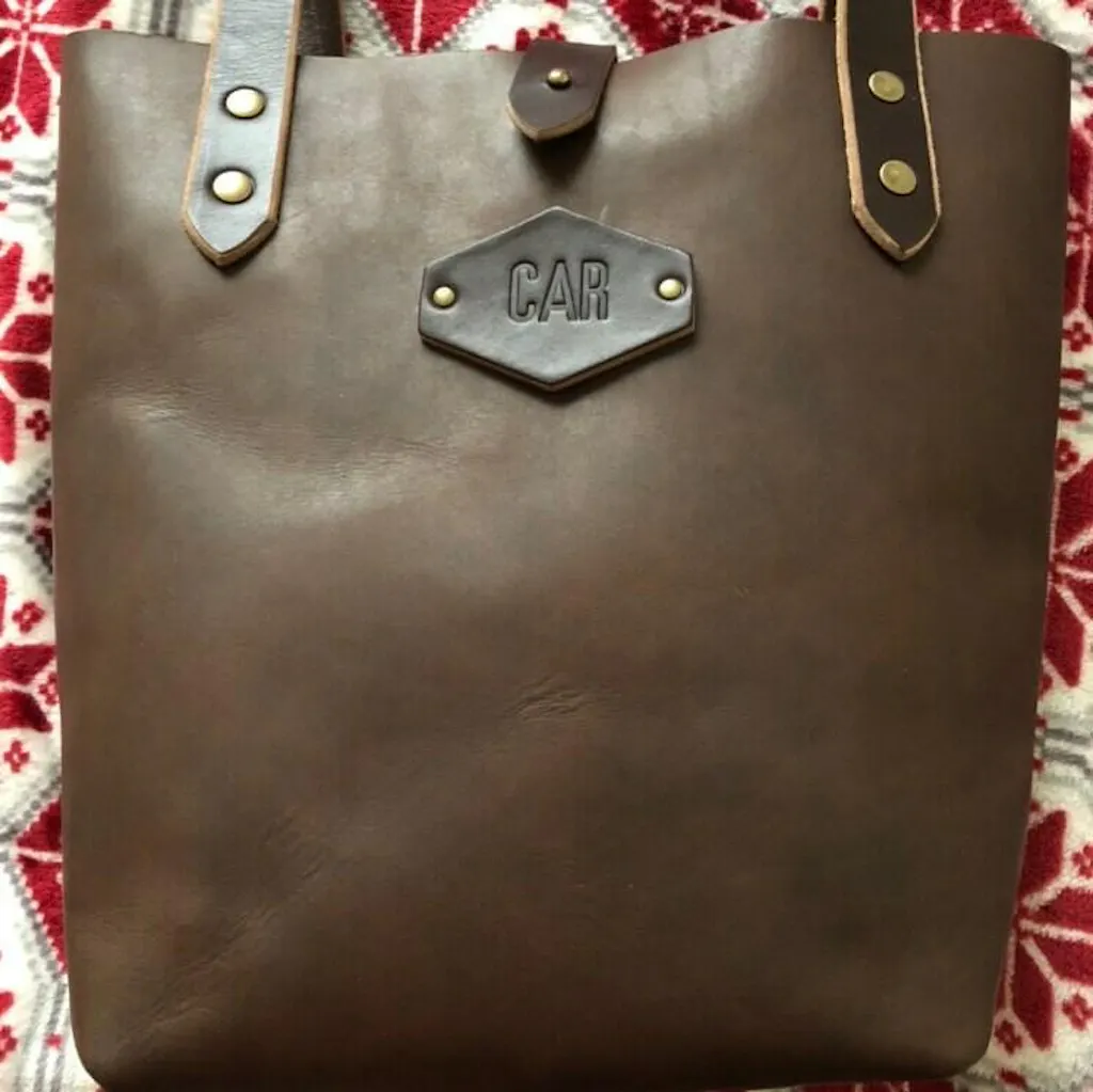 Choose the initials option to add initials on a Hexagon or Oblong leather patch to the outside of your leather tote bag. We use special individual metal pieces and apply heat and pressure for a beautiful impression in the leather! Initials on patch will be all capitals only.
