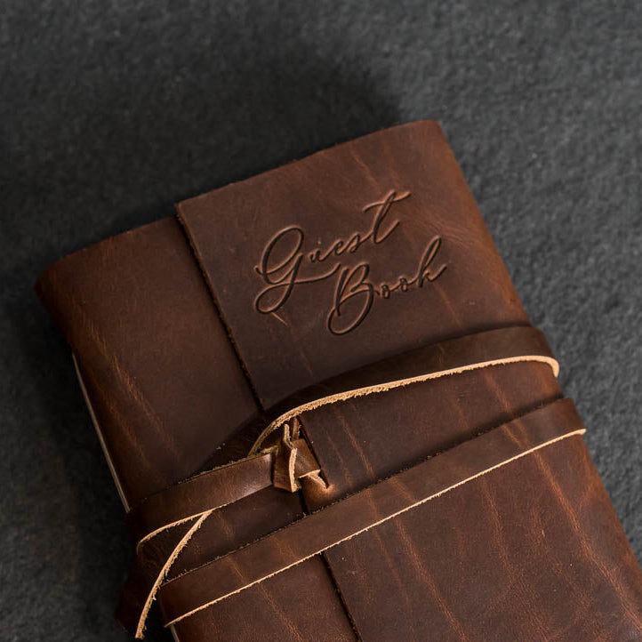 Say 'I do' to this personalized leather Wedding Guest Book! Showcase your special day with custom title page, and collect your guests' beautiful thoughts and well-wishes to remember it forever. A timeless way to remember your special day with beloved family and friends.
