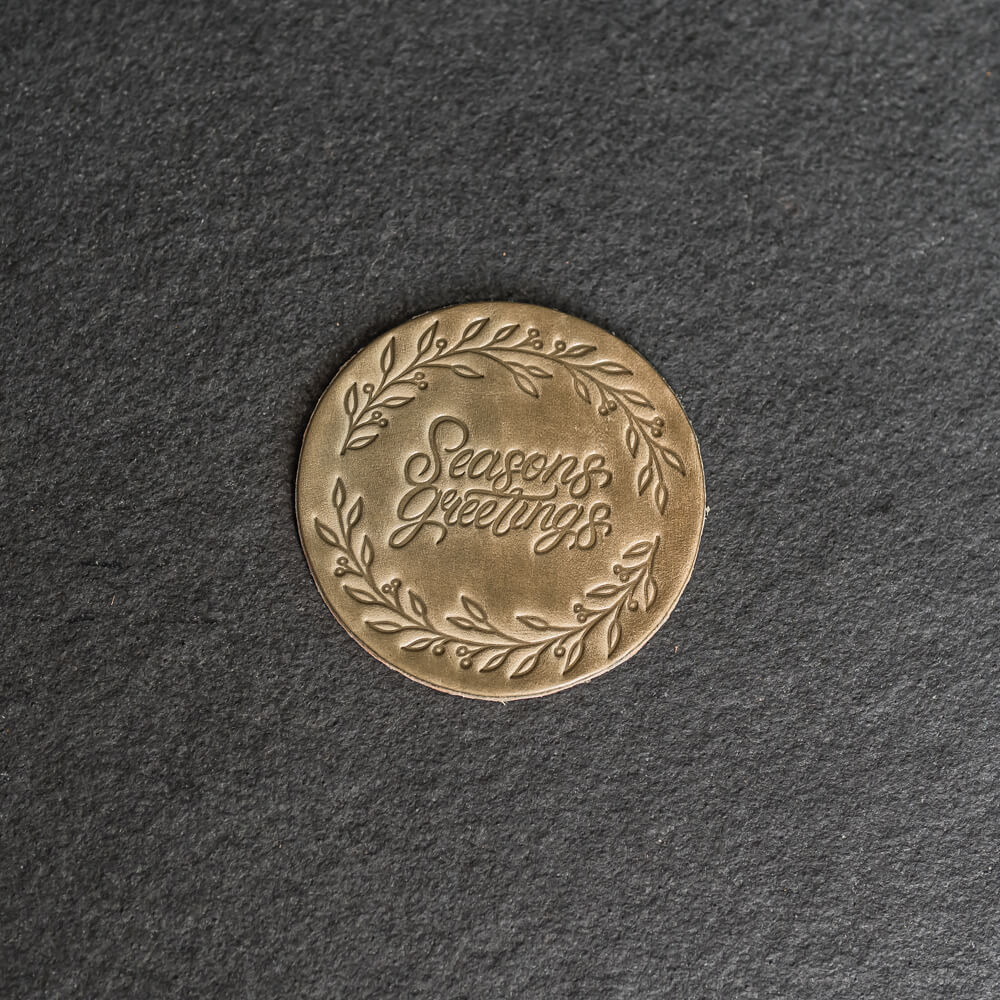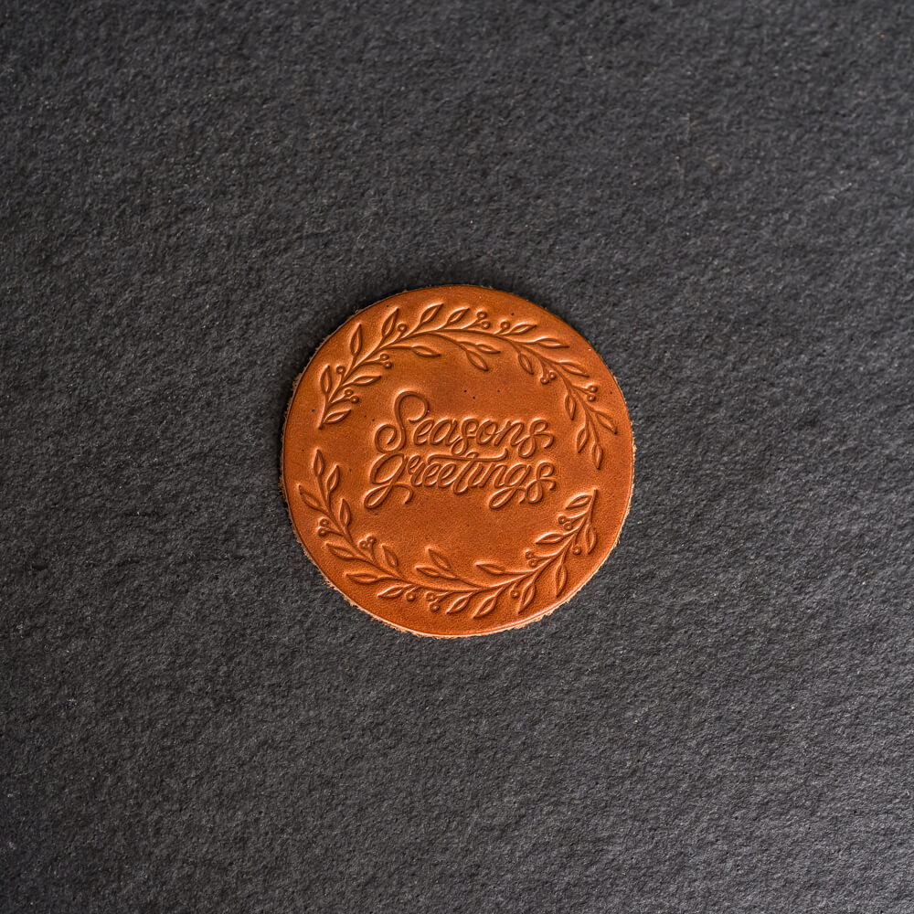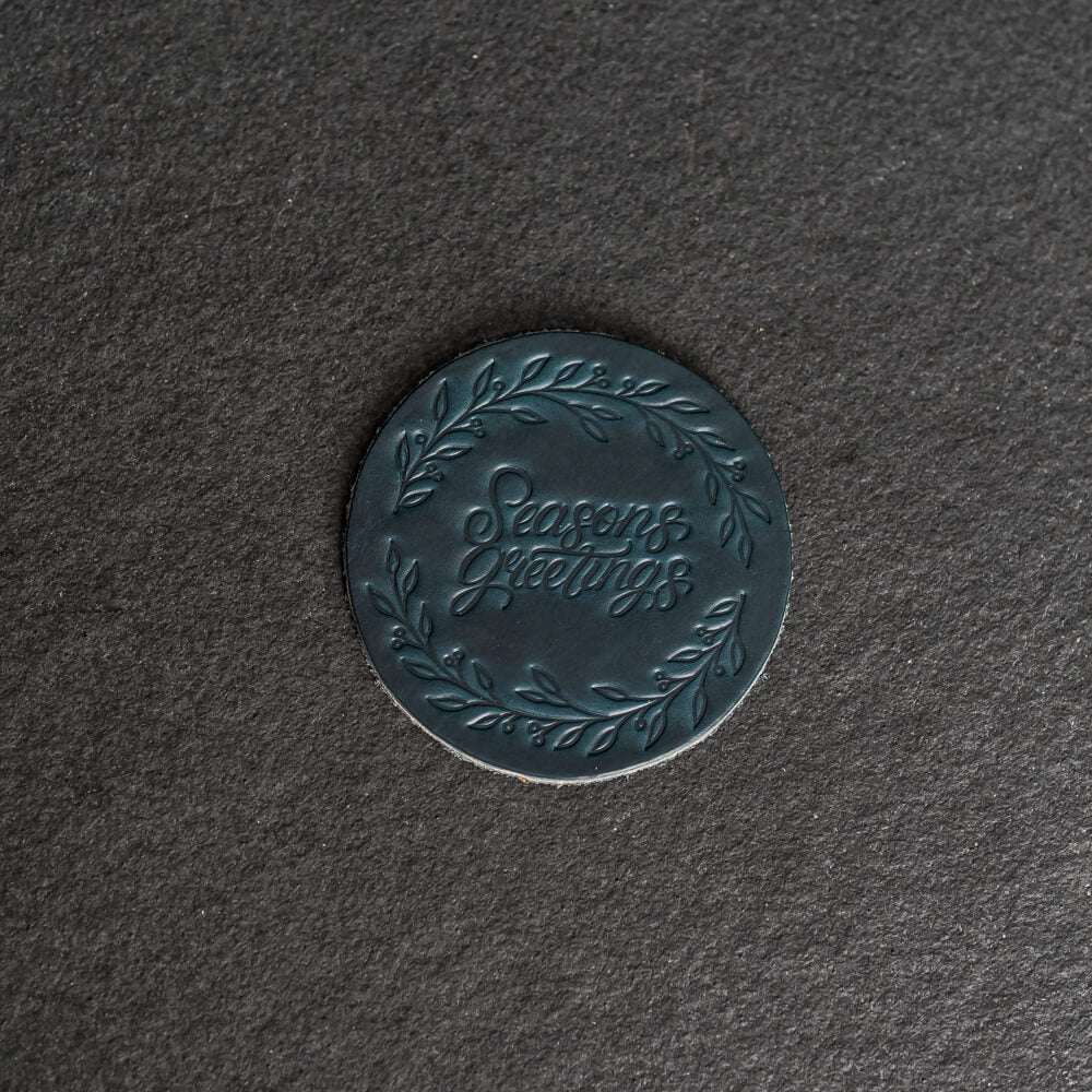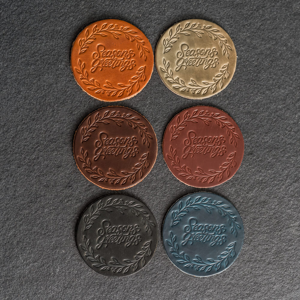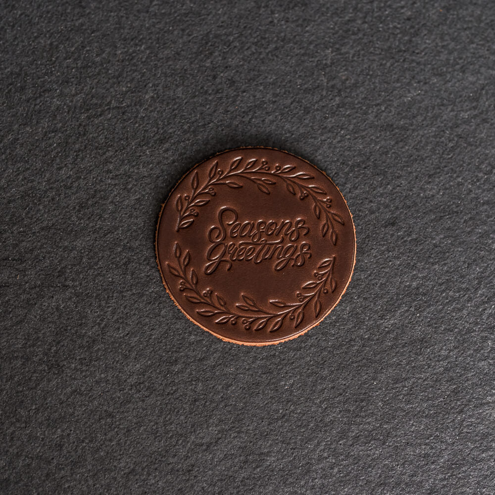 These stylish full grain leather coasters offer sophisticated protection for your table surface with a unique Seasons Greetings stamp design. Sold individually or as a set of 4, they make a great addition to any home or office decor. Excite your guests and add an artistic touch to your space!